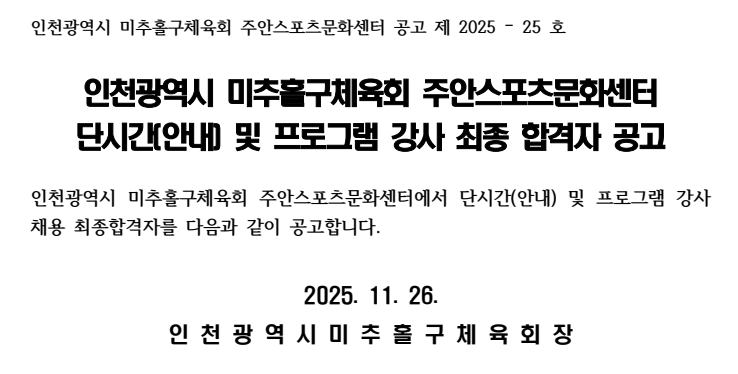 | 첨부파일 251126_주안스포츠문화센터 단시간(안내) 및 프로그램강사 최종합격자 공고.pdf | ||||||