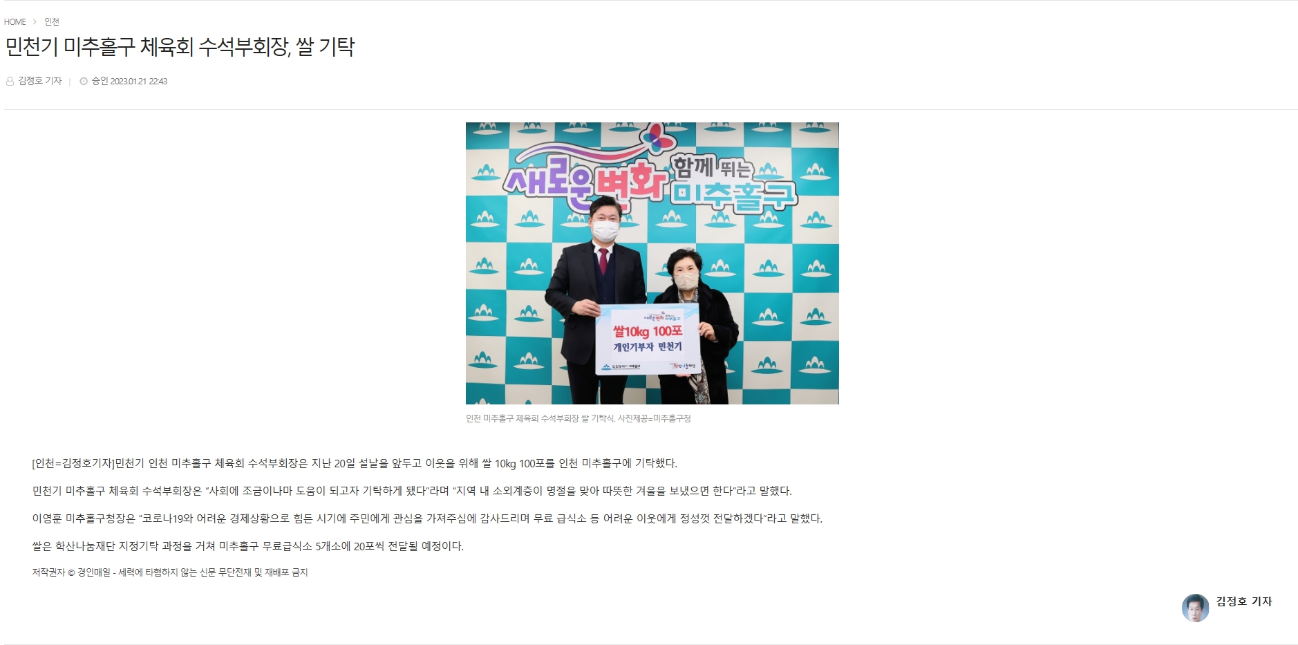 미추홀구체육회 수석부회장 민천기 쌀 기탁