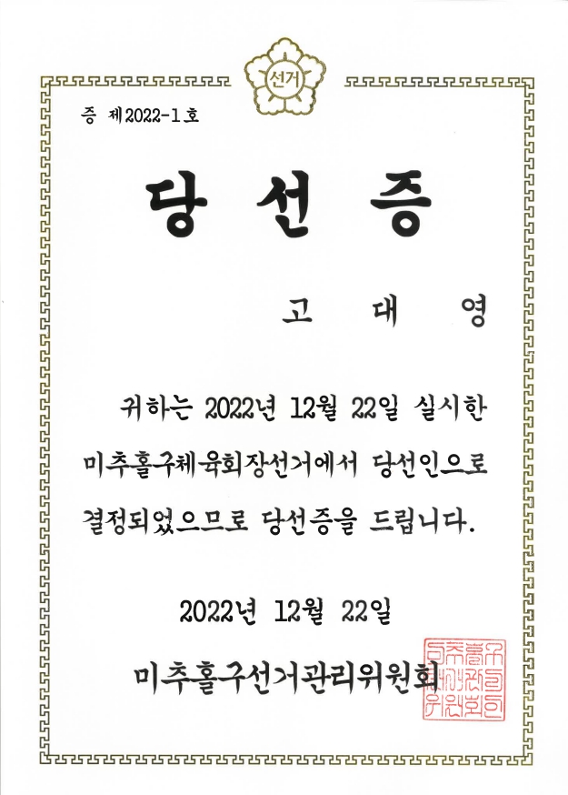 제4대 인천광역시미추홀구체육회장 당선증 교부